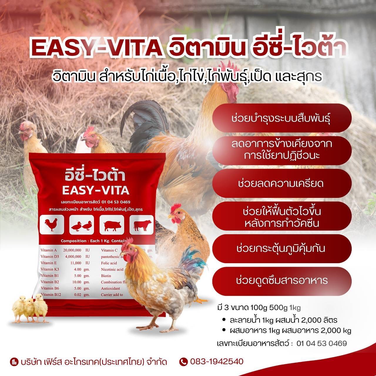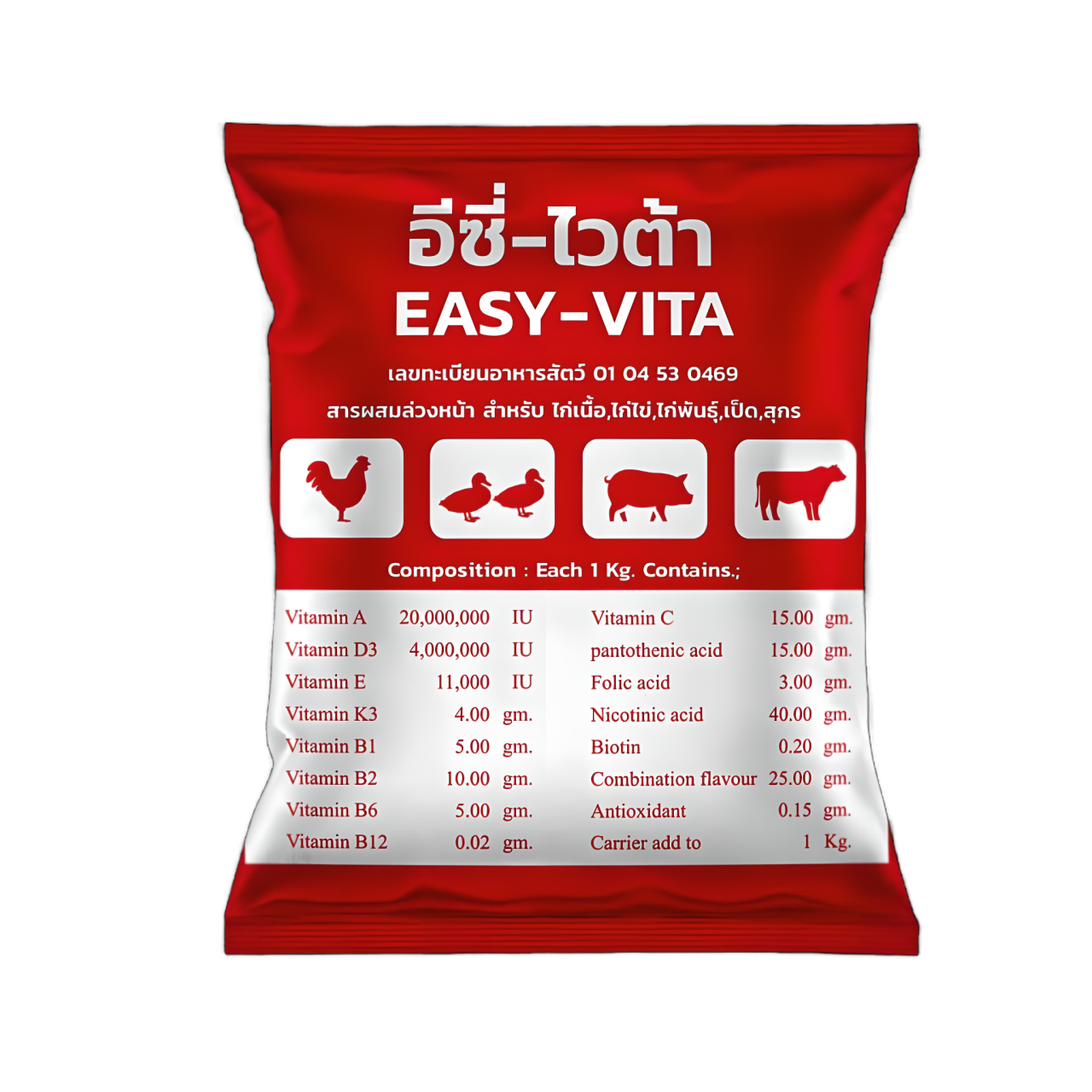 | วิตามิน เอ 20,000,000 หน่วยสากล วิตามิน ดี3 4,000,000 หน่วยสากล วิตามิน อี11,000 หน่วยสากล วิดามิน เค 4.00 กรัม วิตามิน บี1 5.00 กรับ วิดามิน บี2 10.00 กรัม วิตามิน บี6 5.00 กรับ วิดามิน ชี 15.00 กรับ | วิตามิน บี12 0.02 กรัม กรดแพนโททีนิก 15.00 กรับ กรดโฟลิก 3.00 กรับ กรดนิโคทินิค 40.00 กรัม ไบโอดิน 0.20 กรัม สารปรุงแต่งอาหารสัตว์ 25.00 กรัม สารถนอมคุณภาพอาหารสัตว์ 0.15 กรัม สื่อเติมจนครบ 1 กิโลกรัม |